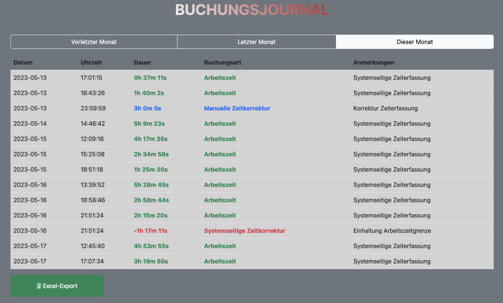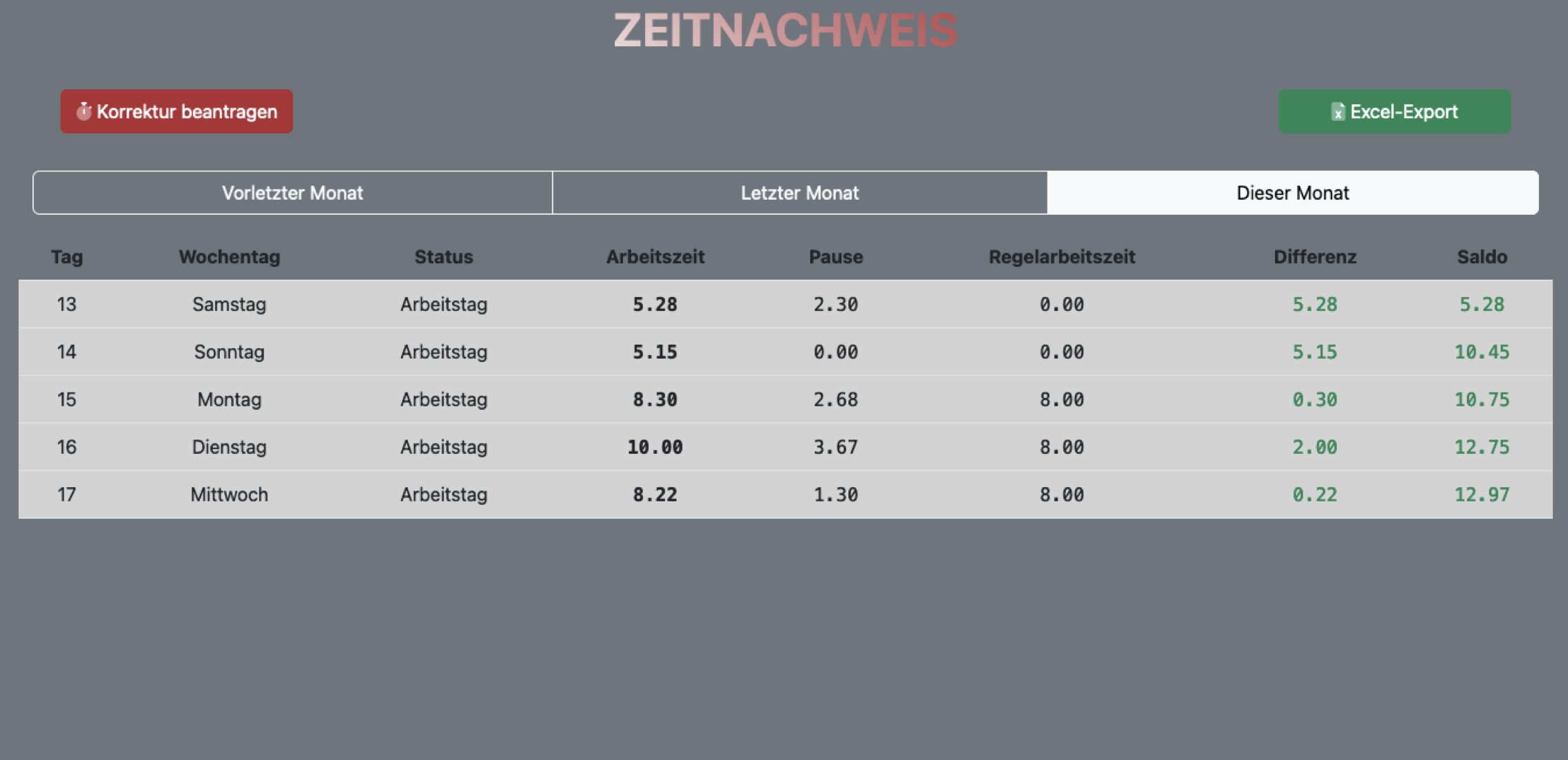 Sehen Sie sich Ihren Zeitnachweis bis zu zwei Monate rückwirkend an, exportieren ihn in Excel oder eine Textdatei und beantragen eine Korrektur, falls Sie z.B. vergessen haben, sich auszustempeln.