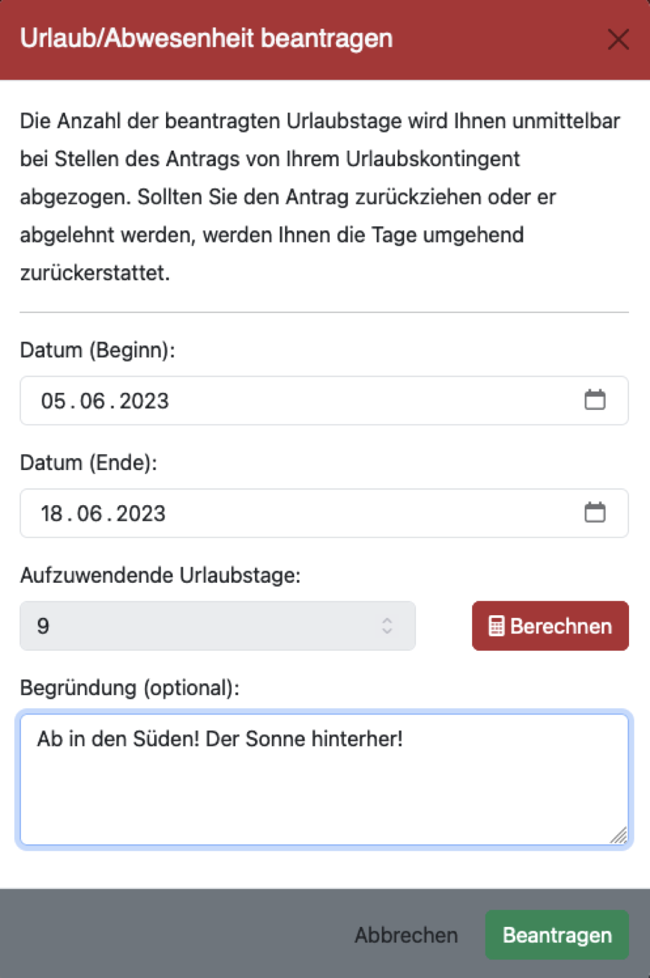 Und wenn Sie Urlaub einreichen möchten, geht das genauso einfach. Geben Sie einfach den gewünschten Zeitraum und eine (optionale) Begründung für Ihren Vorgesetzten ein. Und wenn Sie sich nicht sicher sind, wieviele Urlaubstage Sie Ihre Abwesenheit „kosten“ wird, lassen Sie es sich von TimeAndAttendance einfach schnell berechnen - ganz unkompliziert.