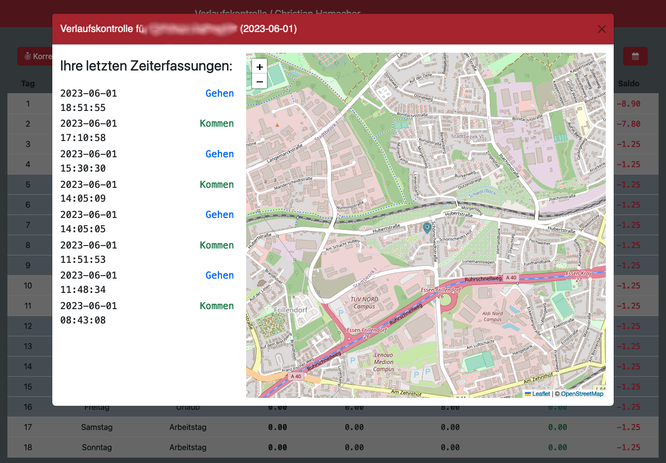 Sie sehen jede Buchung von Arbeitszeit - sekundengenau; außerdem sehen Sie, ob von einem Ihrer Vorgesetzten eine von Ihnen beantragte Arbeitszeitkorrektur vorgenommen wurden.